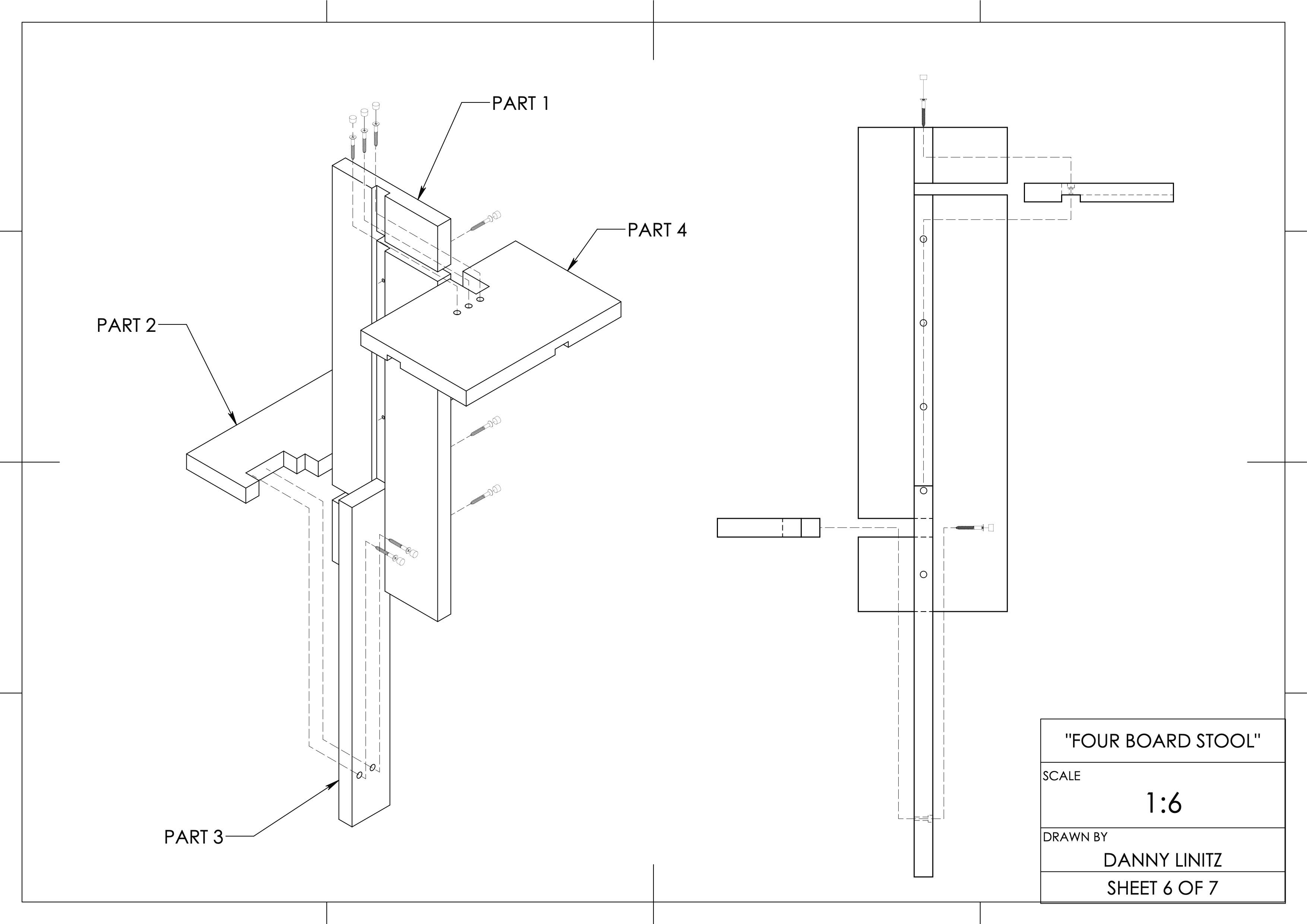 Before moving to fabrication, shop drawings were made to plan out each step in the process. This planning step demonstrates to those in charge of the shop that a thought-through plan exists to craft the stool before a tool is used. This approach helps avoid mistakes and safety mishaps and ensures precision.