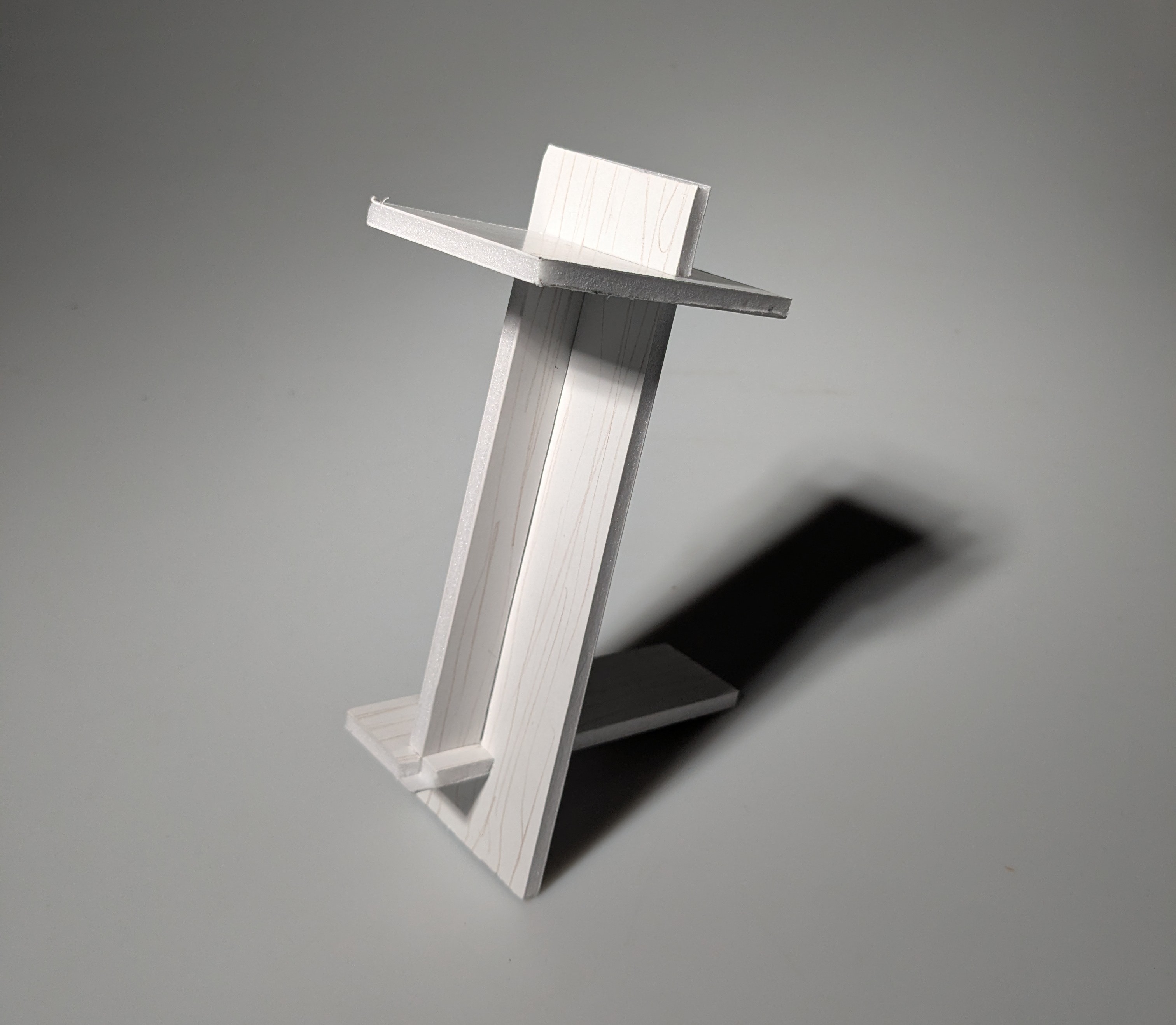 Once the design direction was chosen, a full-scale cardboard model was made to test integrity and proportion. Creating the full-scale model helped reveal some structural weaknesses in the initial design which were not fully evident in the quarter-scale models. Most pressing was potential for seperation between the rib and the long foot piece, which could come apart even with hardware; the goal was to have a stool stable under load even without hardware, the hardware only secondarliy securing the parts together.